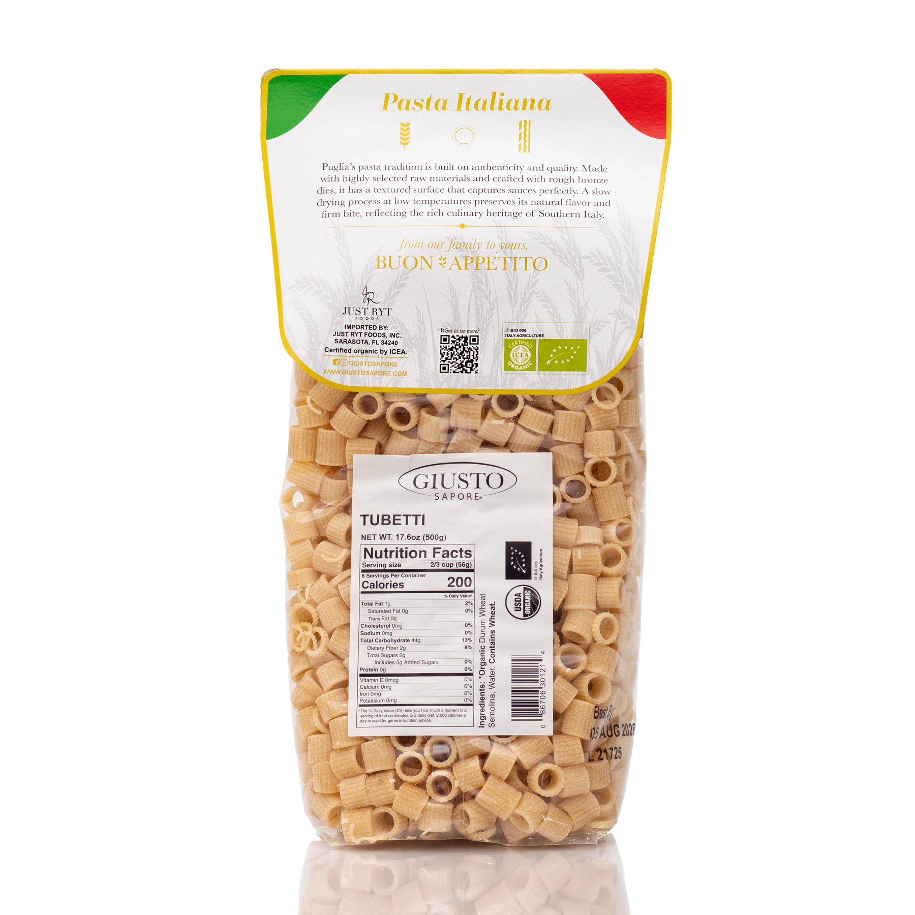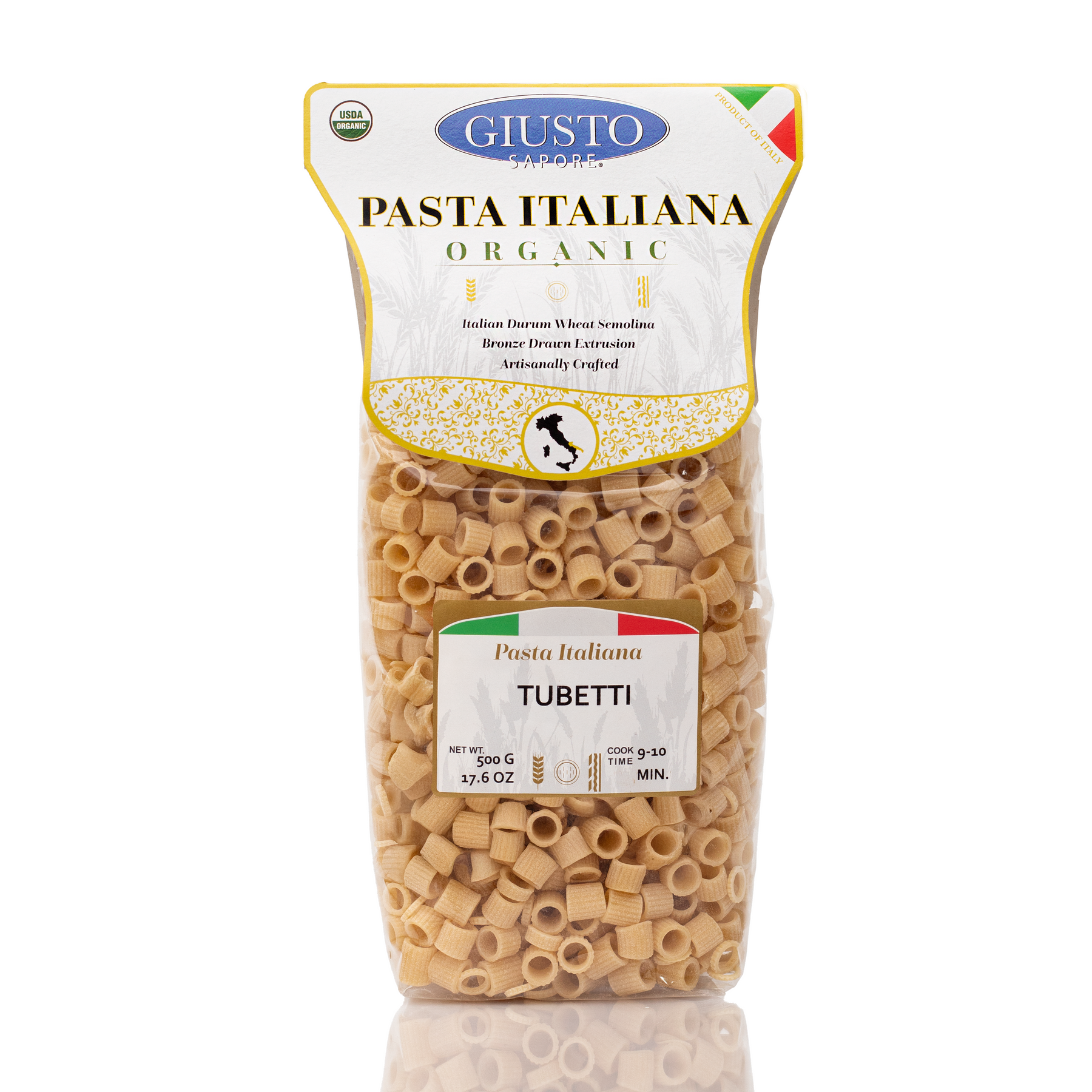 Giusto Sapore’s artisanal Tubetti is made from centuries-old recipes that celebrate traditional and authentic Italian cooking. Our organic, premium pasta boasts 100% of Italy’s finest durum wheat that is extruded through a bronze die, which creates textured, artisanal-quality strands of delicious dough. Our tubetti is slow dried at a controlled temperature to ensure an evenly dried product and then delicately hand packed and inspected for perfection. This fanciful short cut pasta is the ideal addition to any soup, salad, or saucy dish.
